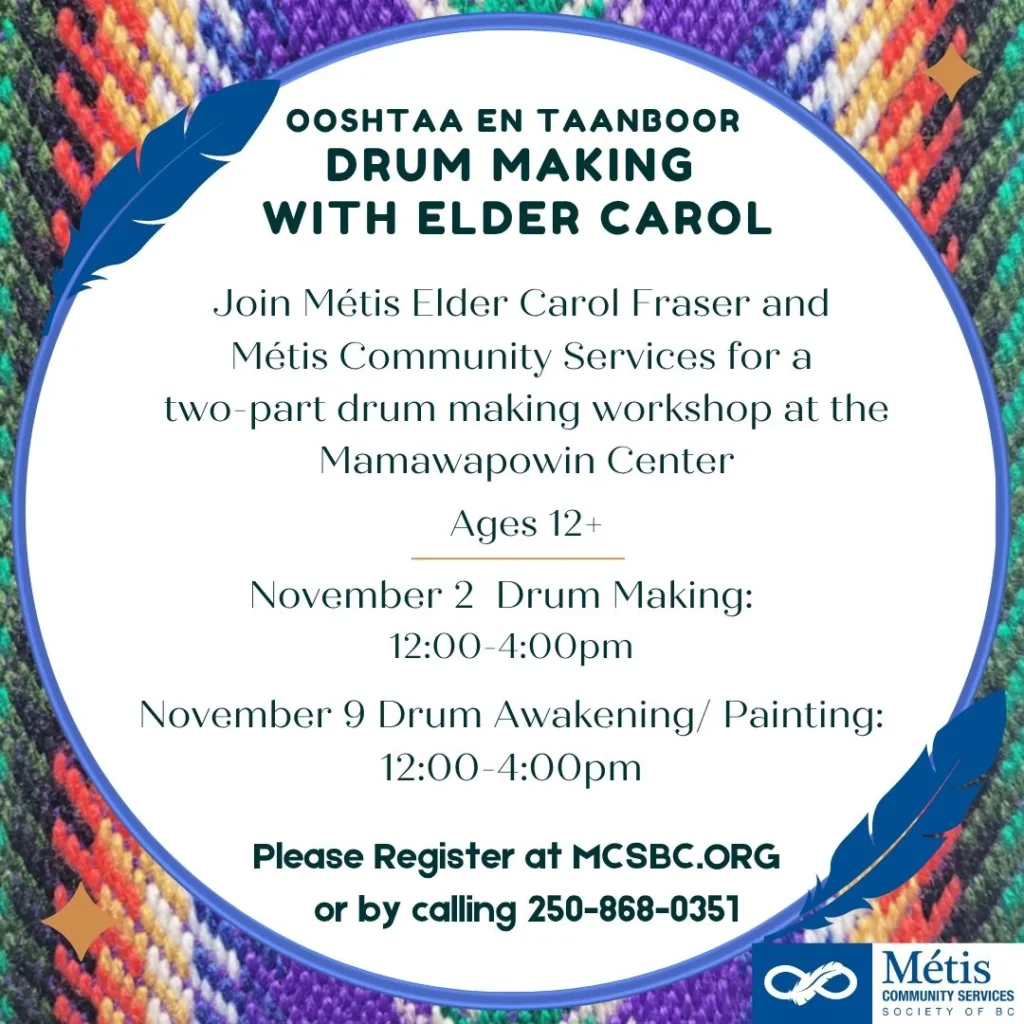 Join Métis Elder Carol Fraser and MCSBC for a two-part drum-making event. The first day, we will gather to create our drums and the second session, we will do a drum waking ceremony with the option to paint your drum afterwards. Each finished drum is unique and contains powerful medicine that all our relations can benefit from.