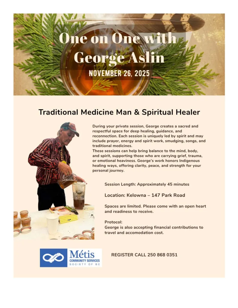 Book a private session with Medicine Man and Spiritual Healer, George Aslin. Sessions will be 45 minutes long and are held at our offices at 147 Park Road, Kelowna. Spaces are limited, please call to register 250-868-0351 or 778-484-2161. (appointment times to be confirmed)