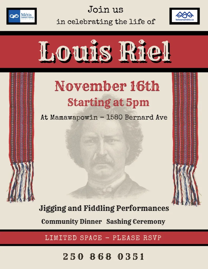 Join us for a celebration of life for Louis Riel. Jigging and Fiddling performances with community dinner and sashing ceremony.