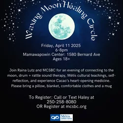 “Join the wonderful Raina Lutz and MCSBC for an evening of connecting to the moon, each other, and Métis teachings during the healing circle on Friday April 11. This is a great way to get grounded and self-reflect.